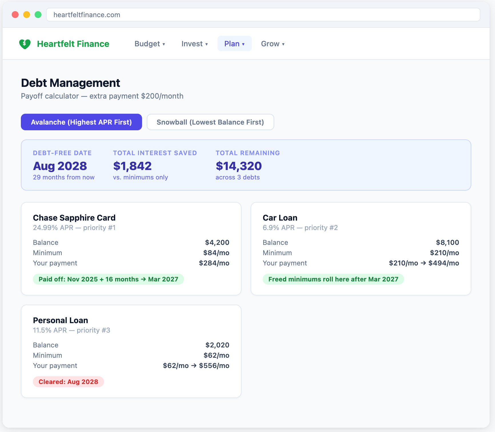 The key mechanic — the one that makes this work — is the roll. When debt #1 is gone, you don’t pocket that minimum payment. You add it to the extra you’re already throwing at debt #2. Freed minimums cascade. A $200 extra payment that clears a $4,200 credit card in 16 months becomes a $484 payment on the car loan the next day. That’s how you go from staring down $14,000 in debt to being debt-free in 29 months instead of seven years.