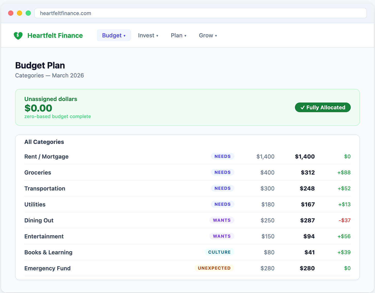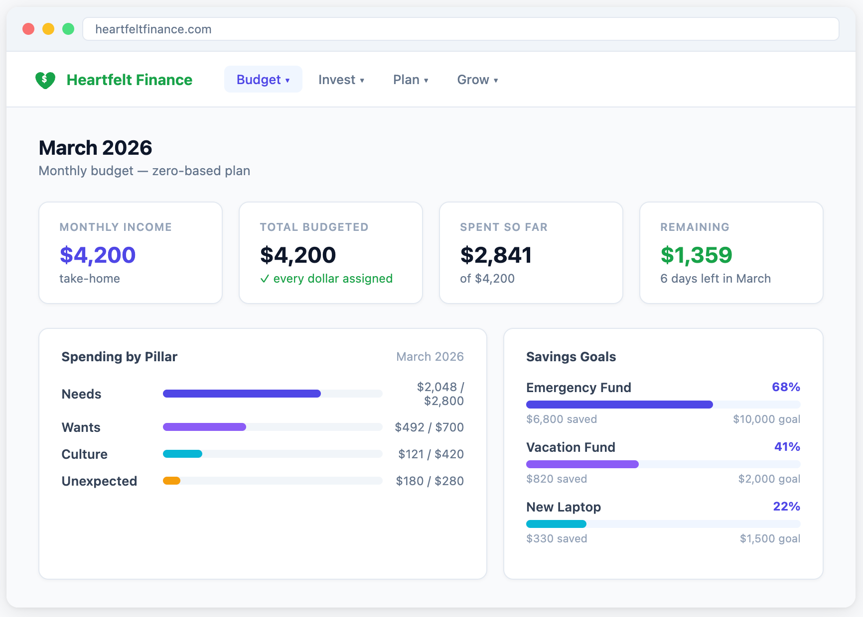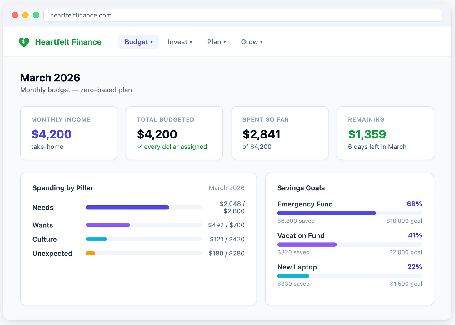 Heartfelt Finance is free. Zero-based budgeting, the four-pillar Kakeibo structure, savings goals, debt payoff simulation (avalanche and snowball), spending reports, values alignment — all of it is free. You don’t need a spreadsheet wizard, you don’t need a $15/month app subscription, and you definitely don’t need to hand $300 to someone to ask you what you earn.