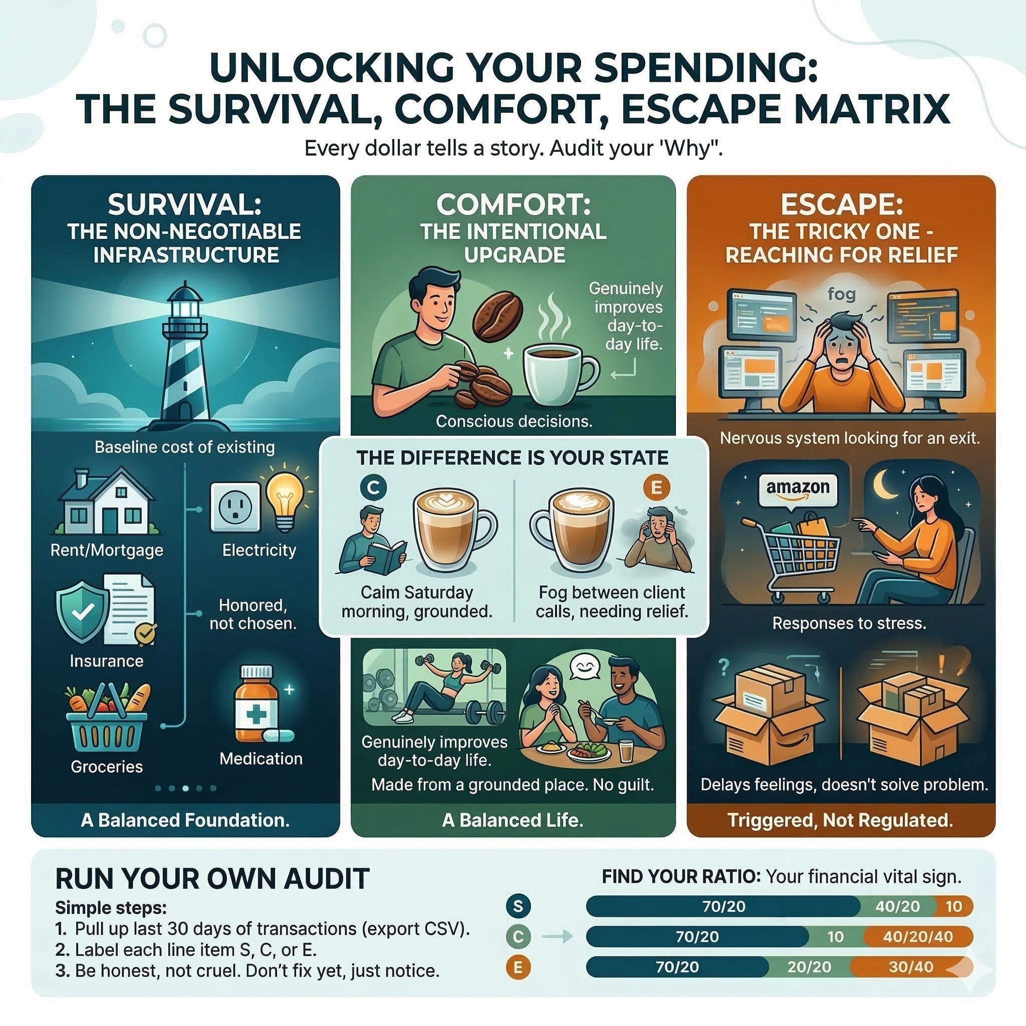 The system looks different. Instead of auditing what you spent, you audit why you spent it. You pull up last month’s transactions and sort every single line item into one of three columns: Survival, Comfort, or Escape. No judgment. Just sorting.